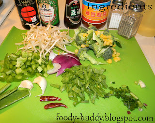 - Add all veggies( brocoli, bell pepper, corn, snow peas and white part of green onion) saute this for 2 mins. Sprinkle some water and cook this for 3 Mins by placing lid on top.