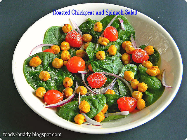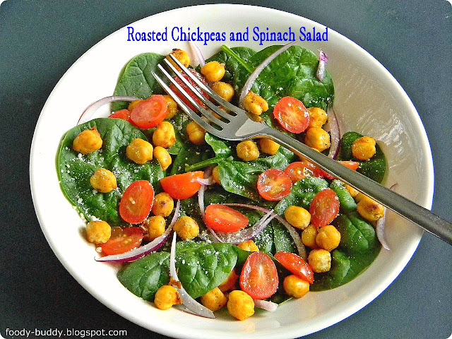 This hearty roasted Chickpeas and Spinach salad has nutrients rich spinach and antioxidants rich chickpeas in it. I love chickpeas either in the form of curry or rice or salad or snack. As this Chickpeas and Spinach salad is fully loaded with fiber, proteins and antioxidants. This versatile salad has roasted chickpeas, which has exotic smell because of addition of cumin, later it was sprinkled over the spinach bed along with onion and cherry tomatoes. This is good for summertime outdoor meals. Try this refreshing, colorful and low calorie Chickpeas and Spinach salad and enjoy.