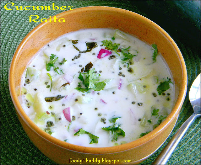 Raita is a cucumber-yogurt salad used in Indian cuisine as a cooling balance to the spicy dishes like biryani. This is so simple and easy to make dish. I really love this raita because of its cooling properties. Best accompaniment for raita is biryani. Also you can use it as dip for pita chips  or potato chips.