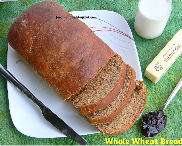 Making bread is not only fun but also gives great satisfaction. I always prefer whole wheat bread than white bread , as whole wheat bread is rich in fiber and other healthy nutrients. I love brownberry wheat bread which they sell in nearby grocery stores. Most of the day I start my breakfast with sandwiches or toast. My favourite is almond/peanut butter-jelly sandwich. You can also see lot of sandwich recipes in my recipe index. When I was searching for whole wheat bread recipe in google, I saw lot of recipes which has all purpose flour in it in addition to whole wheat flour. At last, I got this recipe from King Arthur flour company website which uses 100% whole wheat . I tried making bread 3-4 times, and it always turns out good with this recipe and the aroma of hot bread being baked fresh which I dearly love is enchanting . In this recipe, I added milk and oil, which makes the dough soft and smooth and the addition of honey gives a rich taste to the bread. You can make 1 loaf of bread from this recipe.