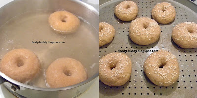 Bagel is a bread product, made with whole wheat flour/ white flour, knead it and shaped it into a ring and baked it in a oven. They are dense, chewy on inside and browned, crispy on outside. You can make bagels with wheat flour or white flour. For health reasons, here I used whole wheat flour to make bagels. Also you can top the bagels with sesame seeds or poppy seeds or oats or any choice. If you make bagels at home, then your breakfast will be ready in mins with some butter and jelly, very filling and yummy:-)