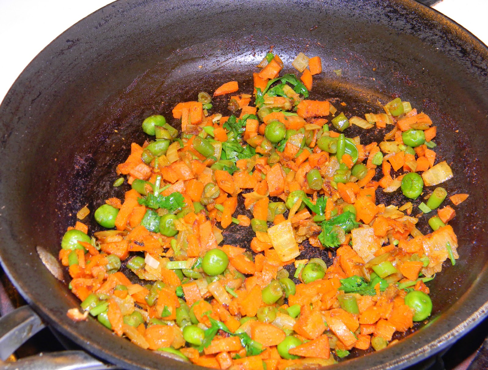 • Add carrot, peas, beans and salt, saute this for few mins and cook until vegetables turns soft.