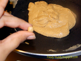 - In a medium flame, add cashew powder to sugar syrup, keep stirring, to avoid lumps.